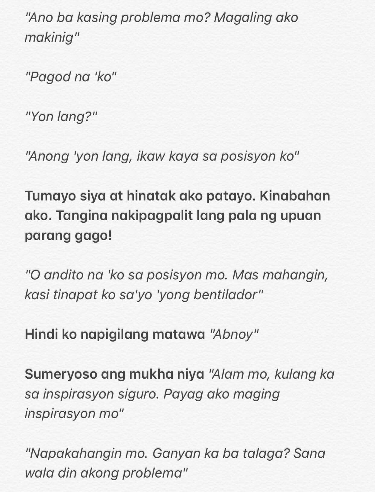 Biglang tinanong nya ako bakit may itatanong ka ba. Bumitaw ako ngunit hindi ibig- sabihin non ayoko na sayo Gusto kita tandaan mo yan. Sigurado hindi niya alam nararamdaman ko.